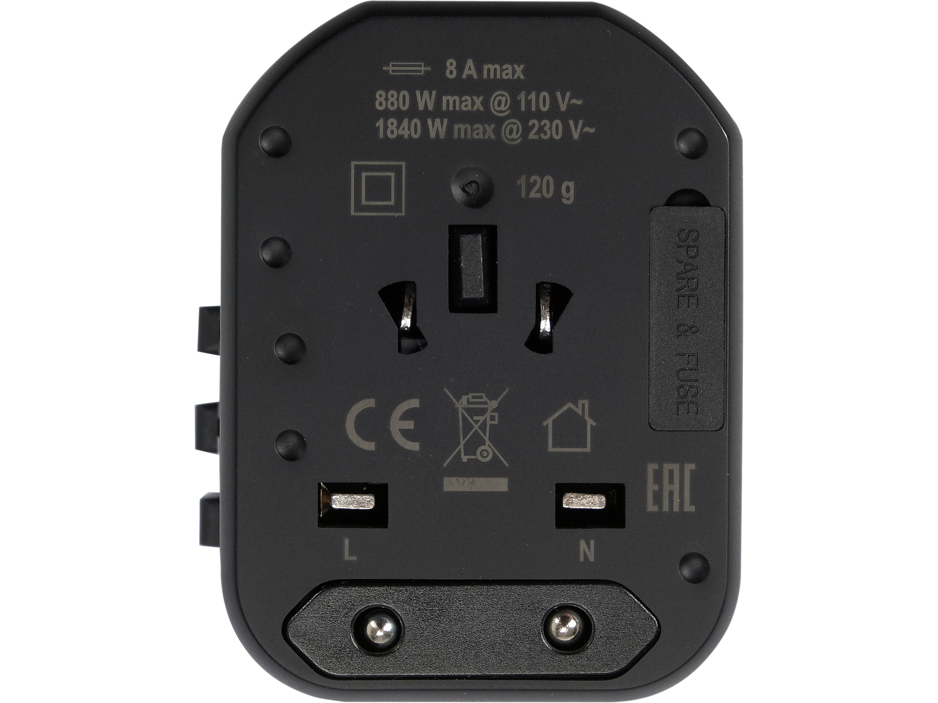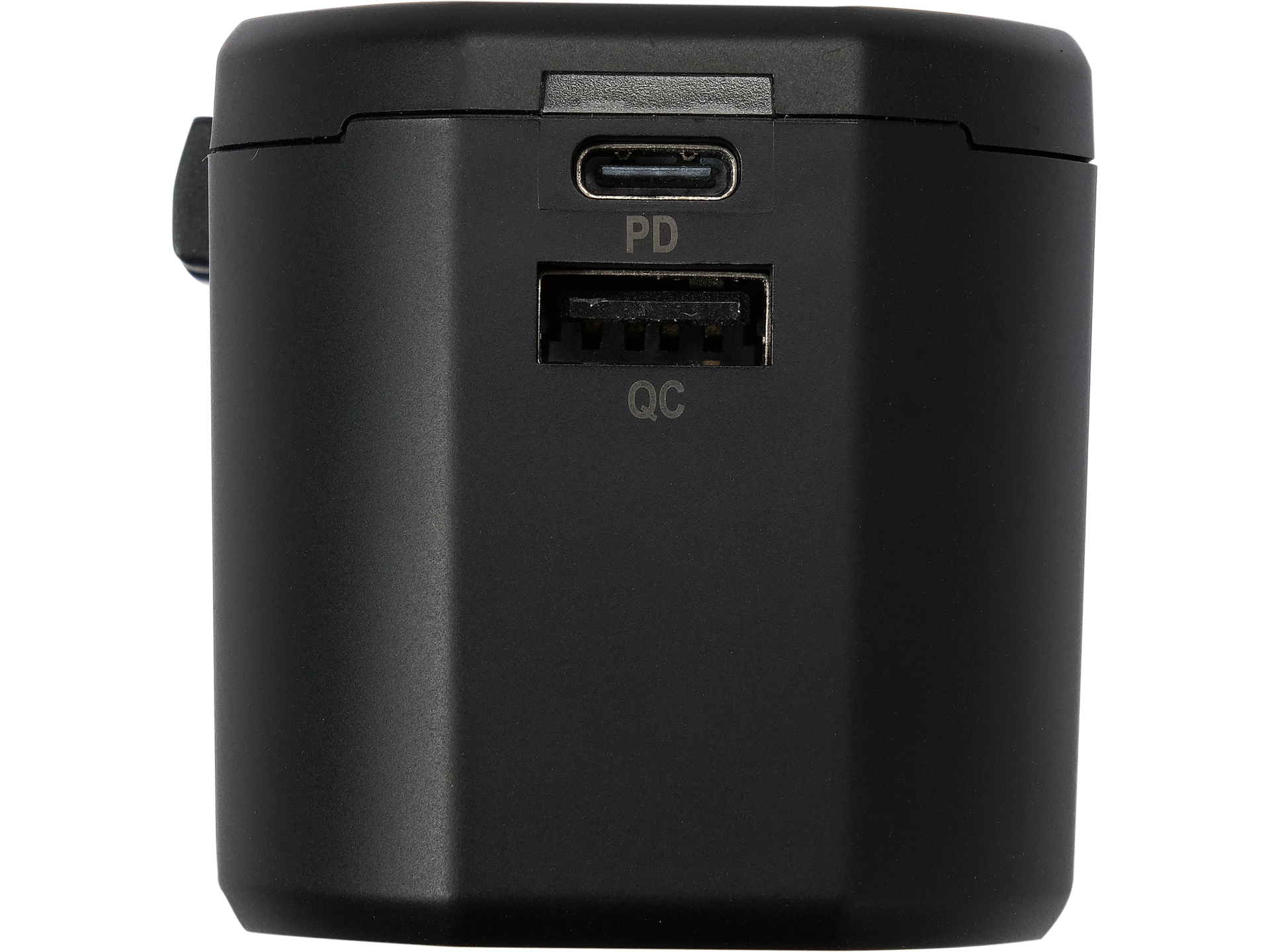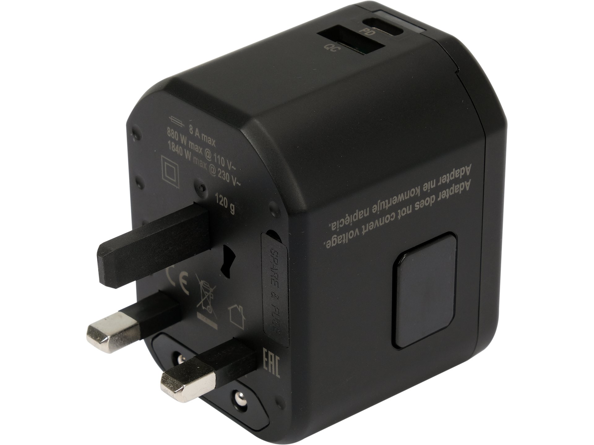 Adaptor universal de putere cu suport pentru prize internaționale (tip I, G, A, C), permițând utilizare în peste 150 de țări. Dispune de port USB-A cu încărcare rapidă QC3.0 și port USB-C cu Power Delivery, cu putere totală de ieșire de 20W. Tensiune de funcționare 110-240V, protecție împotriva supraîncărcării cu siguranță 8A și protecție pentru copii. Compact și ușor (120g), ideal pentru călătorii și utilizări profesionale.