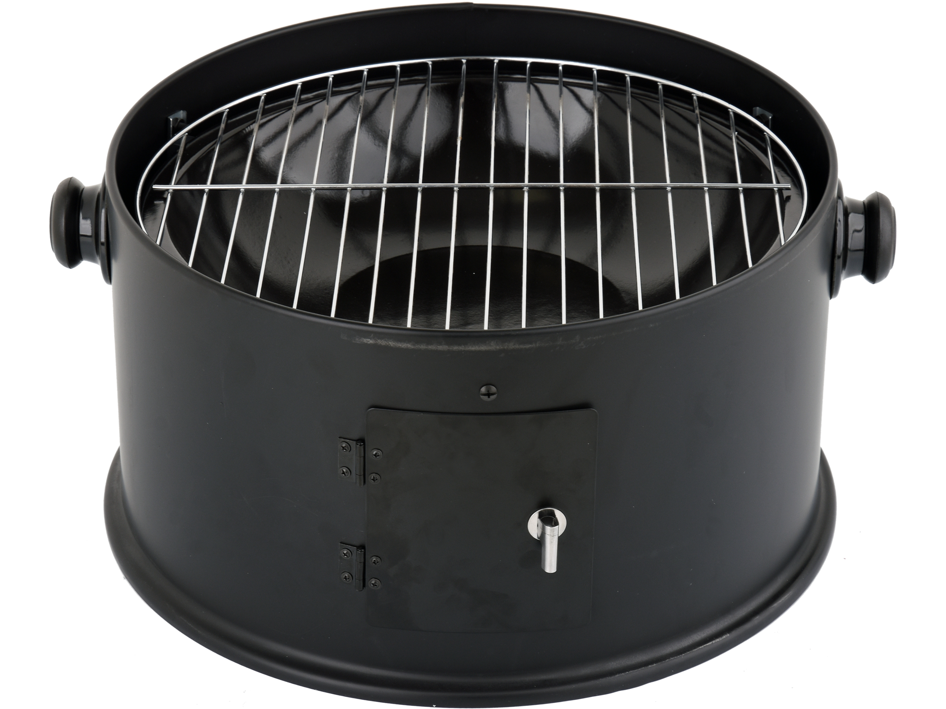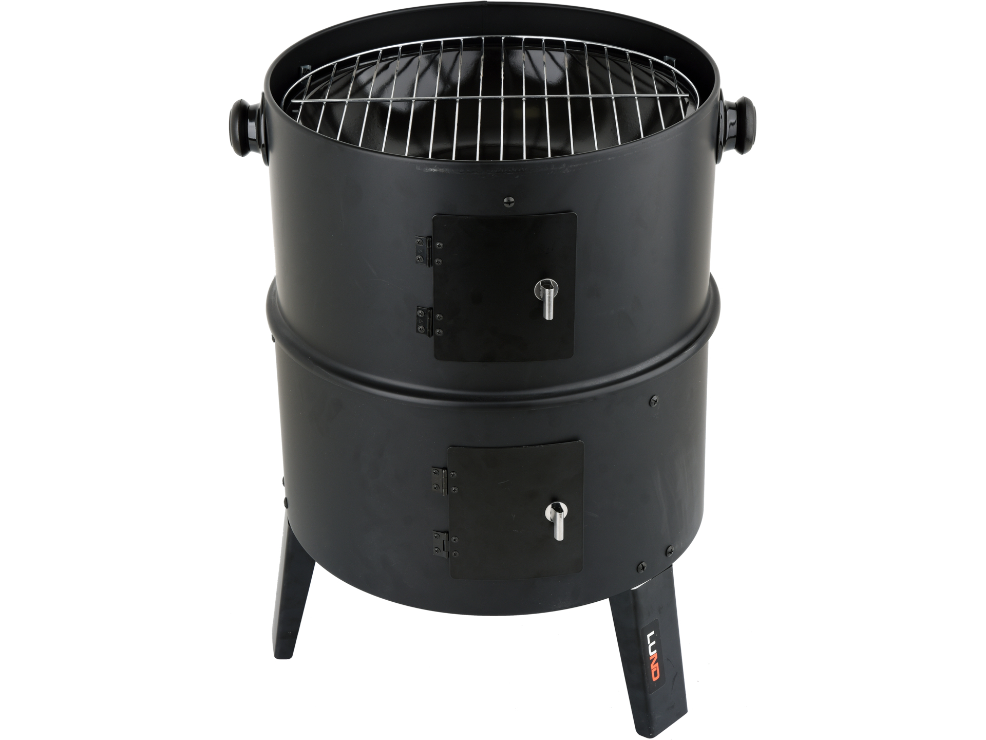 Afumătoare pe cărbune cu dimensiuni 46×41,5×77 cm, construcție din oțel cu finisaj în praf negru mat. Echipată cu două grătare inoxidabile (37,5×25 cm) și bol din porțelan pentru colectarea picăturilor. Sistem de transport ușor cu 3 mânere din oțel și 4 cârlige pentru suspendarea alimentelor. Acoperiș detașabil și ușă laterală pentru acces ușor. Ideală pentru grădini, terase și picnicuri. Portabilitate optimă cu construcție ușoară.