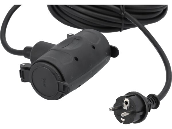 Cablu prelungitor de 10 metri, fabricat din cauciuc de calitate H05RR-F cu protecție IP44, potrivit pentru construcții și utilizări în exterior. Dotare: priză tip F, 1 priză, împământare, suportă curent maxim de 16 A la 230 V. Secțiune conductor 3Gx1.5 mm², putere maximă 3680 W. Culoare negru, fără comutator. Ideal pentru electrocasnice, scule electrice și instalații temporare în condiții de umiditate.