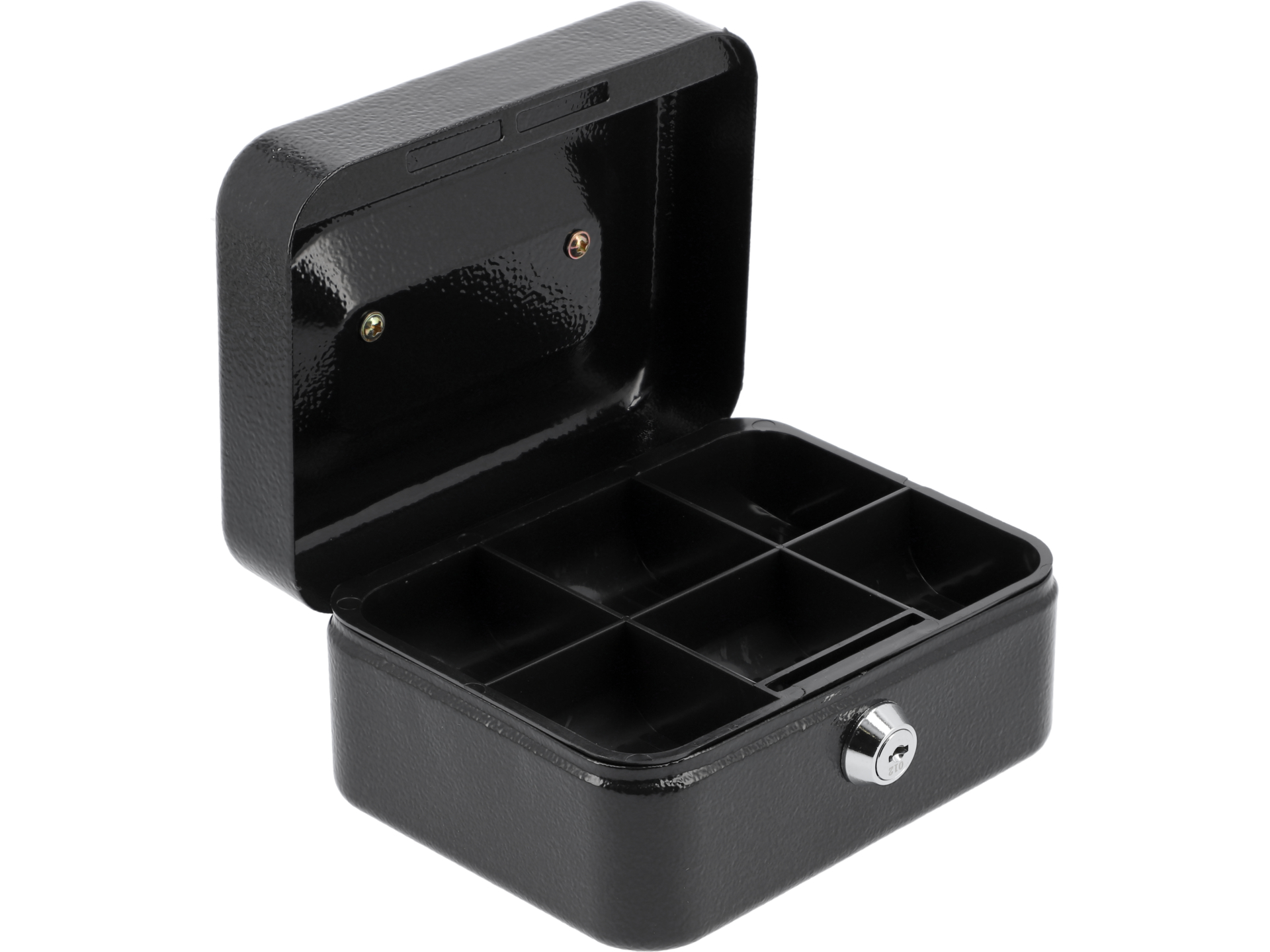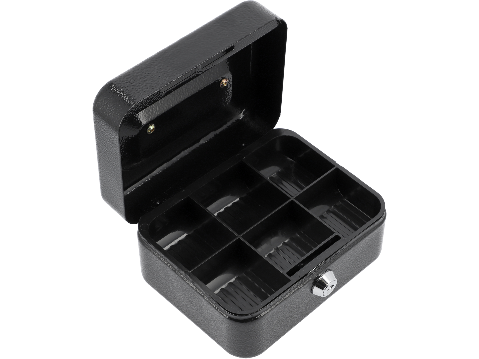Casetă de bani din plăcuță metalică și ABS, dimensiuni 150x120x80 mm, cu pereți de 0.7 mm grosime și finisaj lustruit. Culoare negru discret, sistem de blocare prin instrument și două chei de acces. Construcție robustă, ideală pentru birou, mic comerț sau uz casnic, oferind protecție și organizare pentru numerar.