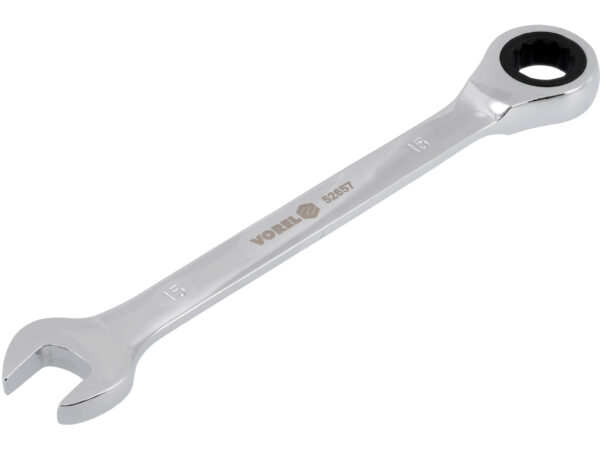 Cheie combinată cu clichet 15mm, eficientă și ergonomică pentru muncă intensă. Fabricată din oțel CrV de calitate înaltă, dispone de 72 de dinți pentru control precis și finisaj cromat lustruit. Lungime totală 200 mm cu grosime 10 mm, ideală pentru acces la spații restrânse. Componenta de zornăială este din 60Si2Mn, asigurând durabilitate și fiabilitate pe termen lung.