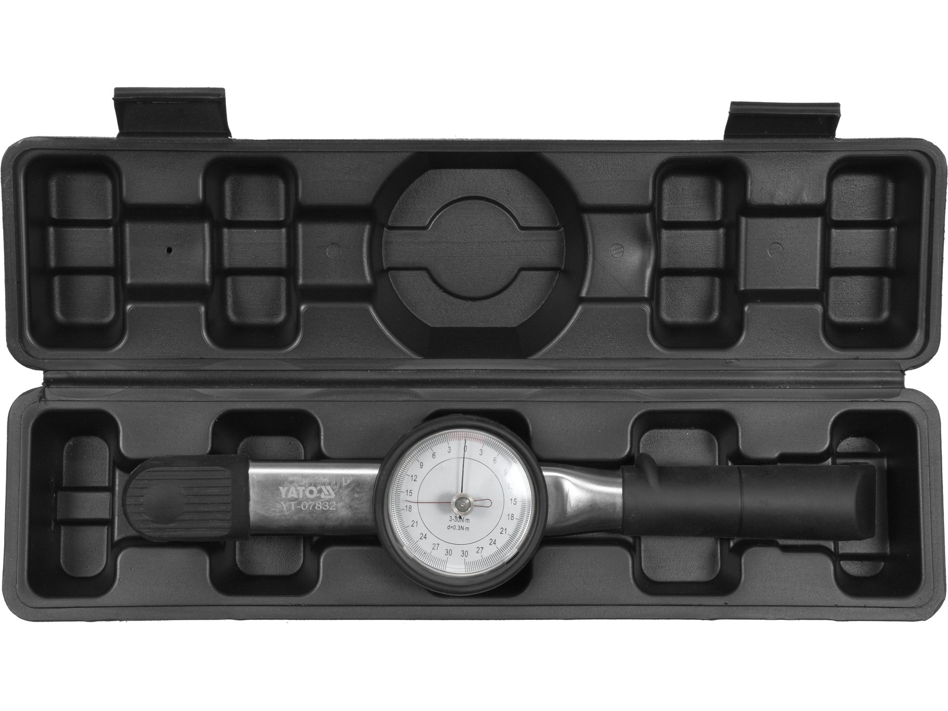 Cheie dinamometrică de precizie cu mecanism cu ceas și interval 3-30 Nm, dotată cu certificat de calibrare. Dimensiune suport 3/8″ (9.5mm), lungime 335mm, construită din oțel aliat cu mâner ergonomic din PVC. Toleranță ±3% asigură strângeri exacte conform standardelor. Perfectă pentru mecanică auto, motociclete, echipamente industriale și alte aplicații unde cuplul precis este esențial. Fiabilitate și acuratețe garantate pentru profesionali.