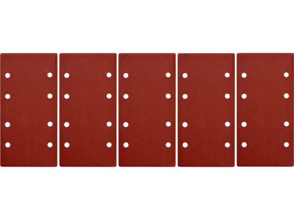 Set de 5 foi abrazive 93×187 mm cu granularitate P220, fabricate din oxid de aluminiu cu liant din rășină sintetică. Designul semideschis cu 8 găuri de ventilație asigură evacuare optimă a prafului și răcire în timpul lucrului. Compatible cu YT-82230, acestea sunt ideale pentru șlefuire pe oțel, lemn, vopsele și îndepărtare de adezivi. Suport din hârtie tip C pentru durabilitate și control superior.