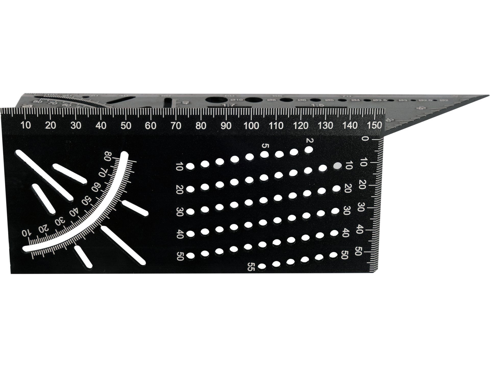 Echer profesional multifuncțional din aluminiu ușor, anodizat pentru protecție și durabilitate. Dimensiunile de 150x70x215 mm cu grosime de 2.8 mm îl fac portabil și ușor de utilizat. Include scară metrică și funcții variate: șablon coadă de rândunică pentru îmbinări precise, șabloane de găuri și raportor integrat. Esențial pentru tâmplari și meșteri care necesită măsurări rapide și exacte în diverse proiecte.