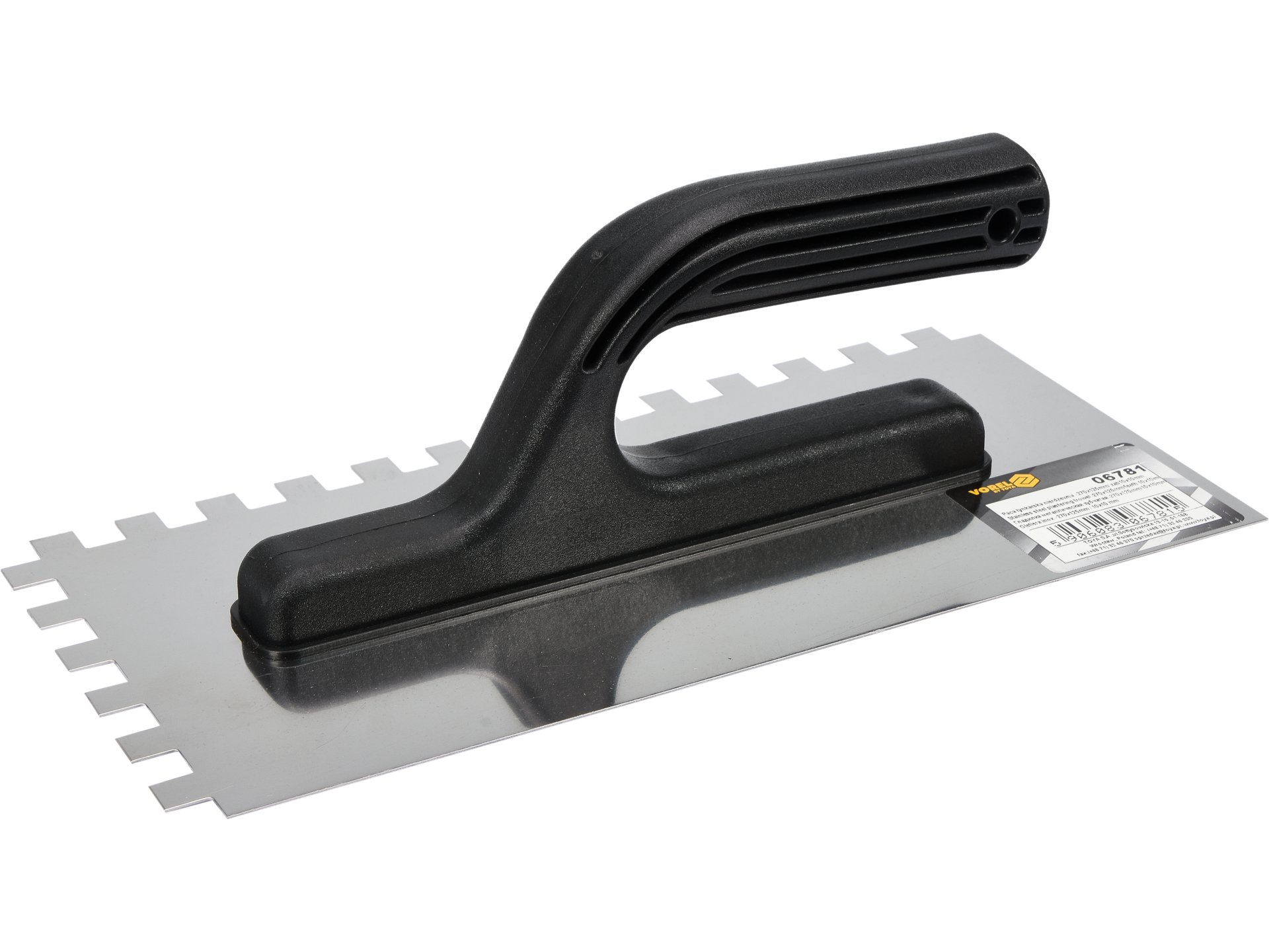 Gletieră din oțel inoxidabil cu dinți crestați de 10×10 mm, proiectată pentru aplicații profesionale de finisaj și zidărie. Dimensiuni 270×125 mm cu mâner ergonomic din PVC.