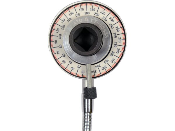 Goniometru cu fixare clemă și suport 1/2″ (12,7 mm) pentru măsurarea și setarea unghiurilor de strângere. Domeniu de activitate 0-360 grade, cu scară cu diviziuni de 2 grade pentru precizie. Furtun de 500 mm permite manevrabilitate ușoară în spații înguste. Aplicație ideală pentru strângerea finală a șuruburilor și piulițelor cu unghi specific de rotație, utilizat în mecanică și asamblări precise de componente.