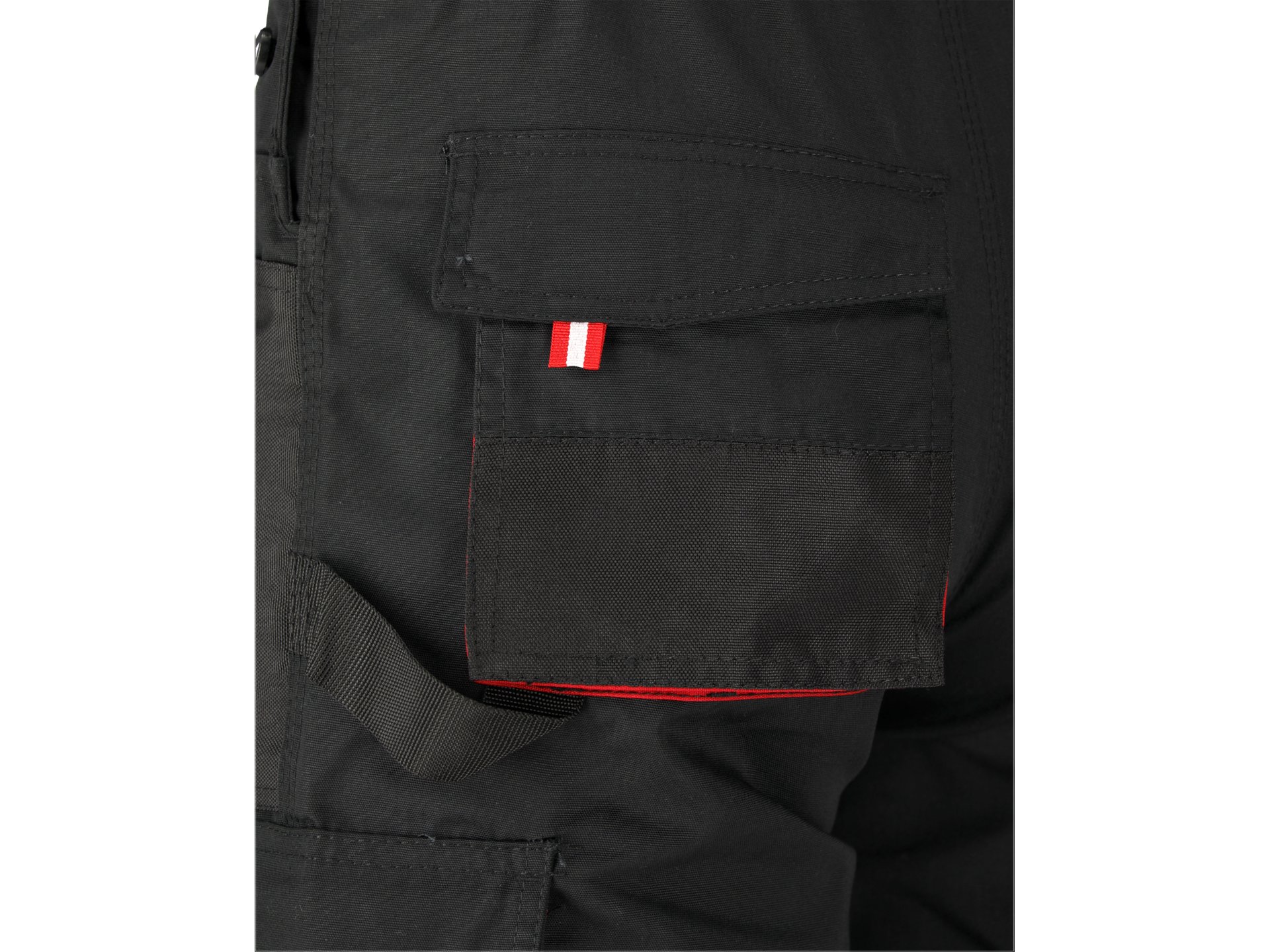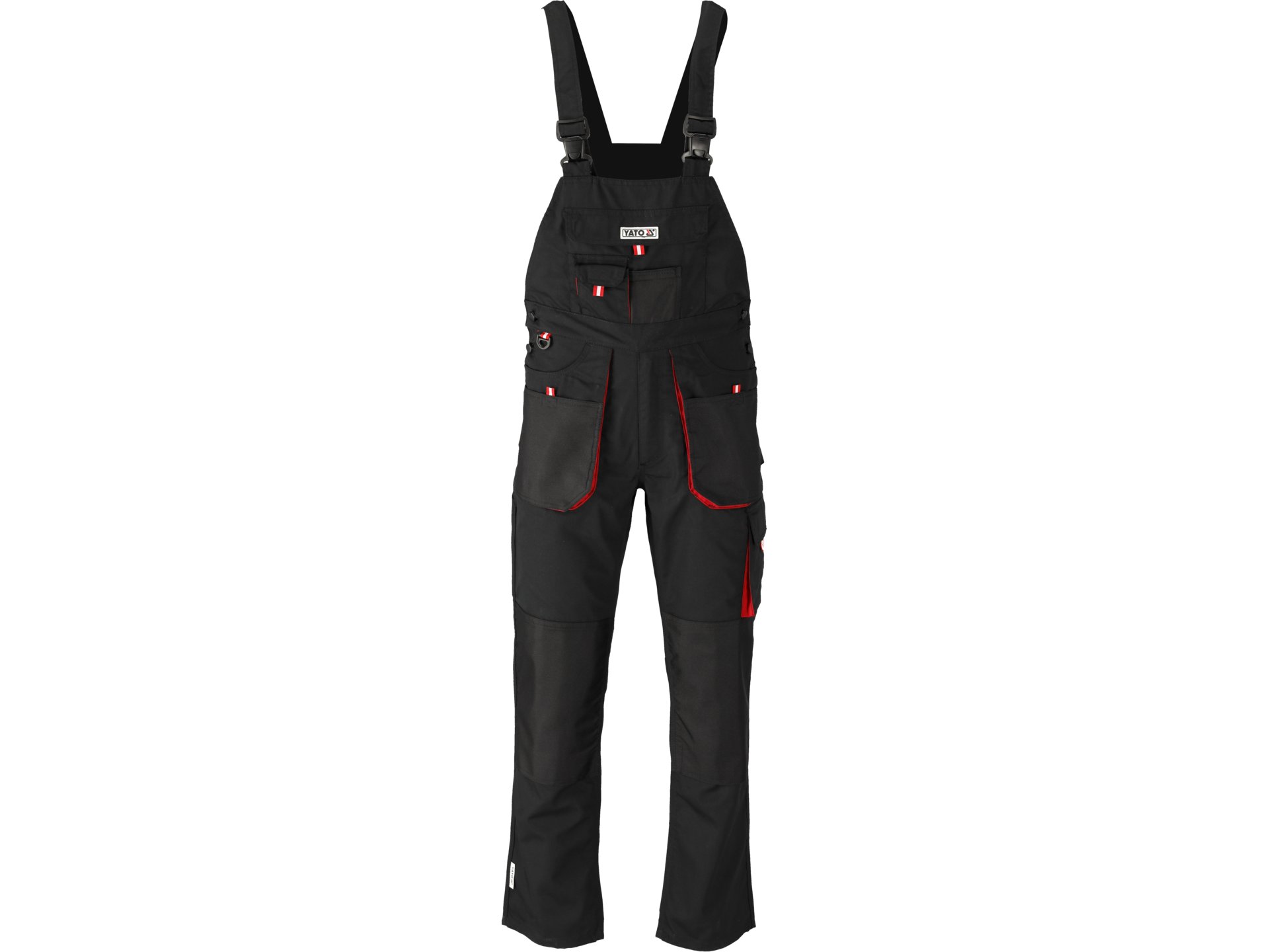Echipament de protecție categoria I, confecționat din țesătură hibridă 65% poliester și 35% bumbac cu greutate de 275 g/m². Potrivit pentru persoane cu înălțimea 172-180 cm și circumferința taliei 82-90 cm. Culoare negru și roșu. Include 11 buzunare externe cu locuri dedicate pentru genunchiare, talie elastică și reglare laterală cu nasturi. Închidere cu fermoar sigur.