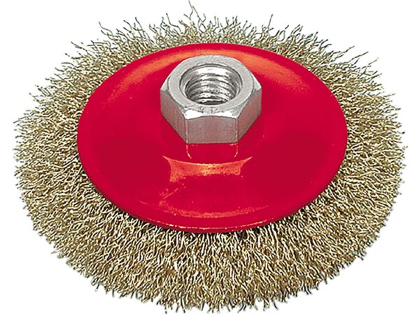 Perie circulară din sârmă sertizată, diametru 100 mm, ideală pentru curățare și polisare pe roți de polizor. Firul din sârmă placat cu alamă asigură durabilitate și eficiență. Compatibilă cu sisteme de prindere M14, viteză maximă 12500 RPM.