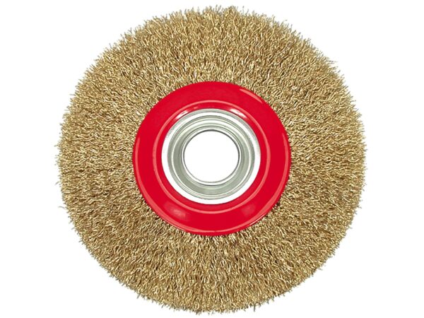 Perie rotativă din sârmă sertizată, diametru 125mm, cu sârmă din oțel placat cu alamă pentru curățare agresivă și lustruire. Viteză maximă 6000 rpm permite lucru rapid și eficient pe suprafețe metalice, roșii și coroziune. Design compact și efect uniform de curățare.