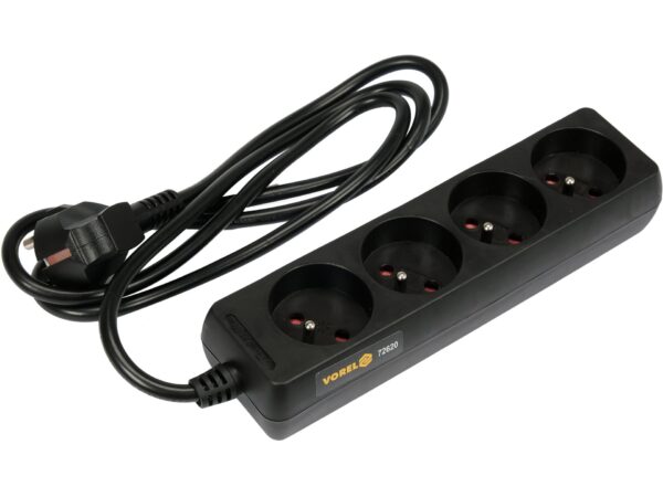 Prelungitor sigur cu 4 prize și împământare, ideal pentru birou de lucru și aplicații profesionale. Lungime 1,5 m, curent maxim 16 A la 230 V, 50 Hz. Cablu H05VV-F cu secțiune 3Gx1 mm² asigură protecție deplină împotriva scurtcircuitelor. Fișe tip E și F pentru compatibilitate universală. Izolație robustă și design compact pentru spații de lucru limitate.