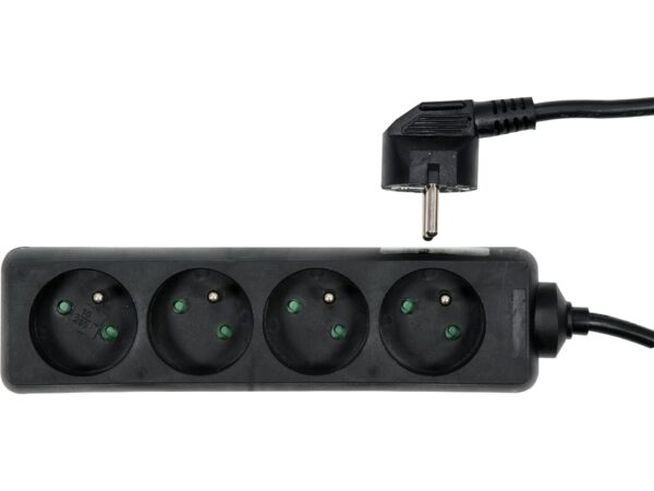 Prelungitor electric de birou cu 4 prize tip E&F, împământat, lungime 3 m. Curent maxim 10 A, tensiune 230 V AC, frecvență 50 Hz. Cablu de tip H05VV-F cu secțiune 3G x 1 mm², izolație dublă pentru siguranță ridicată. Culoare negru. Fără comutator. Distribuite constant și fiabil curent electric în spații de lucru.