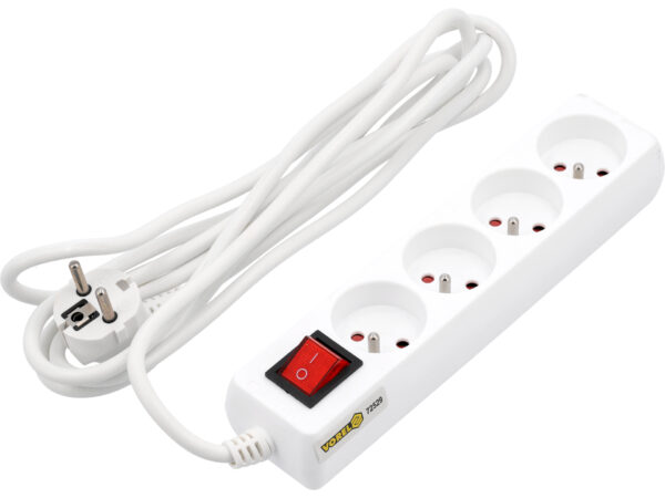 Prelungitor profesional de 3 metri, echipat cu 4 prize de tip E și F cu împământare, perfect pentru birouri și ateliere. Dispozitivul integreaza un întreruptor comod pentru control rapid al alimentării, iar cablul H05VV-F cu secțiune 3Gx1 mm² asigură distribuția sigură a energiei la curent maxim de 10 A.