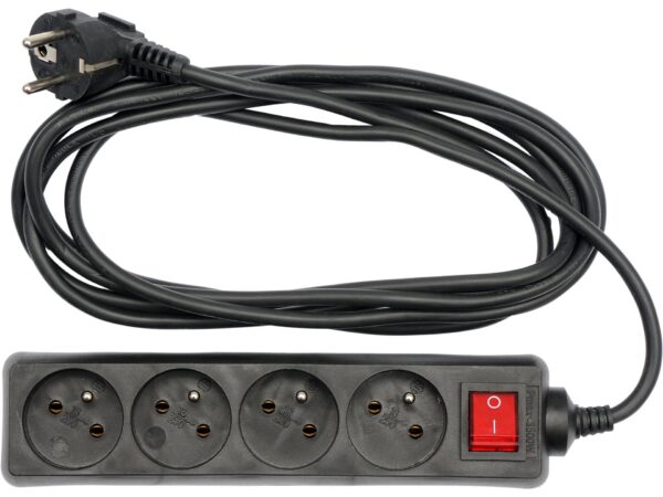 Prelungitor profesional cu 4 prize tip E și F, cu împământare și întreruptor integrat pentru control ușor al alimentării. Lungimea de 3 metri permite conectarea echipamentelor la distanță, iar cablul H05VV-F oferă izolare sigură. Curent maxim de 10 A și tensiune 230 V a.c. se potrivesc pentru echipamente casnice și semi-profesionale. Culoare neagră discretă, design compact pentru birou și șantier.