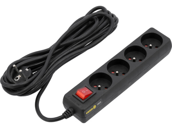 Prelungitor de birou cu 4 prize cu împământare tip E, lungime 5 m și curent maxim 10 A. Dotată cu întrerupător independent, permite controlul ușor al alimentării și protejează împotriva supraîncărcării. Cablul H05VV-F cu secțiune 3Gx1 mm² oferă siguranță și flexibilitate pentru mediile de lucru profesionale.