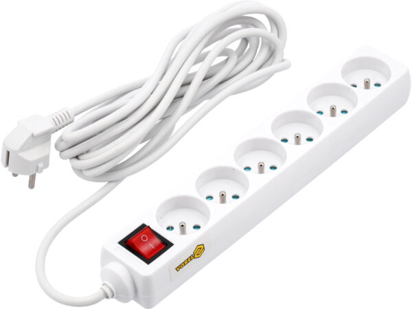 Prelungitor profesional cu 6 prize și comutator, lungime 5 m, ideal pentru birou de lucru și șantiere. Asigură distribuție sigură a curentului (230 V, 10 A maxim) cu protecție prin împământare. Cablul H05VV-F cu secțiune 3Gx1 mm² garantează o transmisie sigură a energiei, iar priza de tip E și F permite compatibilitate cu echipamente standard. Finisajul alb ușurează identificarea cablului în spații de lucru aglomerate.
