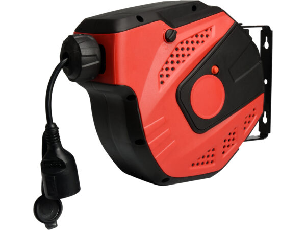 Prelungitor de perete cu bobină automată retractabilă, lungime 10 m, curent maxim 10 A la 230 V. Cablu H05VV-F 3Gx1.5 mm² cu izolare și protecție completă, priză tip E+F cu împământare. Carcasă și tambur din PVC negru, rezistent la radiații UV și agenți chimici. Rebobinare automată facilitează depozitarea și transportul, capacitate maximă 1500 W la cablu complet bobinat. Grad protecție IP20, soluție practică și durabilă pentru diverse aplicații în interior.