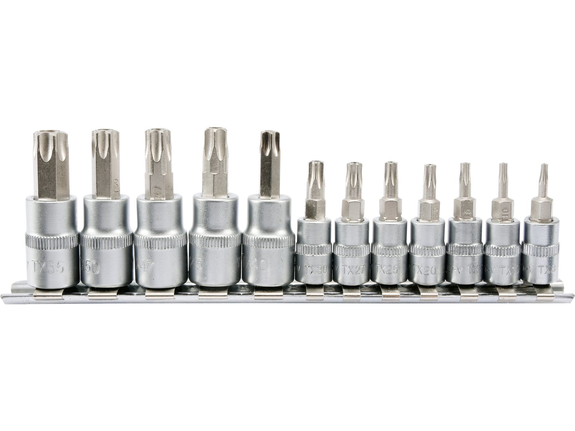 Set 12 biți Torx cu vârfuri dure și finisaj cromat, pentru lucru cu șurubelniță, rezistent și durabil.