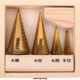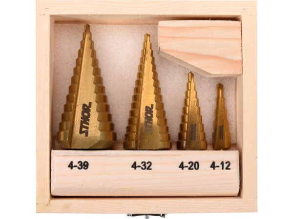 Set de 4 burghie în trepte cu diametru progresiv, ideale pentru găurire în oțel. Realizate din material HSS 4241 cu acoperire de nitrură de titan pentru durabilitate și performanță superioară. Grosimea maximă de tăiere de 4 mm și suport triunghiular pentru fixare sigură în aparat. Disponibile în patru variante de diametre pentru diverse aplicații profesionale.