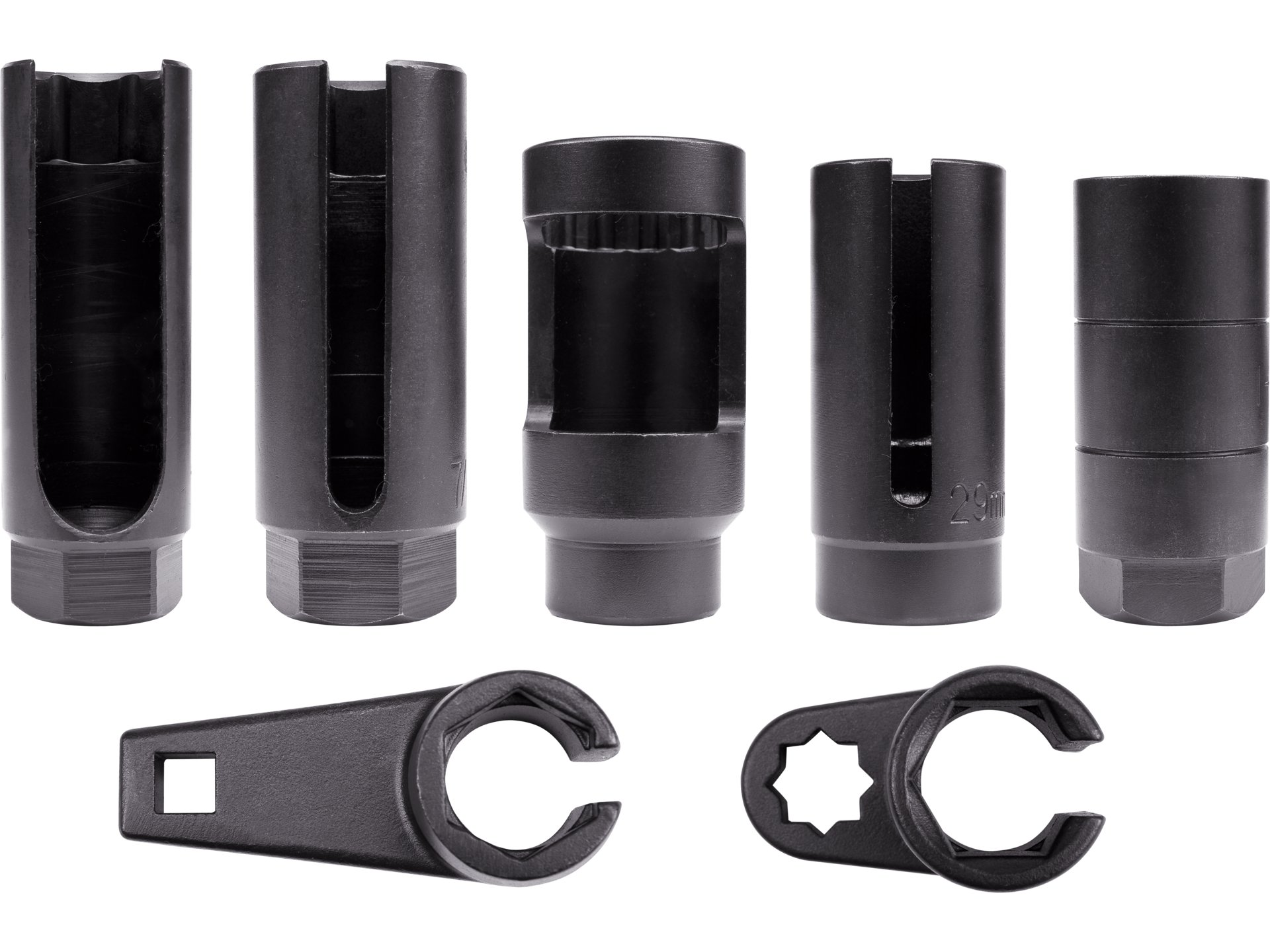 Kit profesional pentru diagnostică și reparare motoare, cu 7 chei tubulare din material CrMo SCM-440 și CrV 50BV30 de înaltă rezistență. Mărimi variate (22, 27, 29 mm) pe suporturi duale 1/2″ și 3/8″, adaptate pentru lucru la sonde lambda și injectoare de combustibil. Construcție durabilă și precizionism pentru aplicații în mecanică fină.