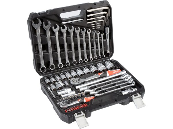 Set complet de 77 de piese pentru reparații profesionale, disponibil în două dimensiuni standard: 1/4″ și 1/2″. Fabricat din materiale de înaltă calitate (CrV 6150, CrMo SCM-440, S2), cu capete AS-DRIVE și 72 de dinți pentru performanță superioară. Potrivit pentru mecanici, service-uri auto și aplicații industriale diverse. Scule versatile și durabile pentru reparații de precizie, demontări și montări în condiții de lucru exigente.