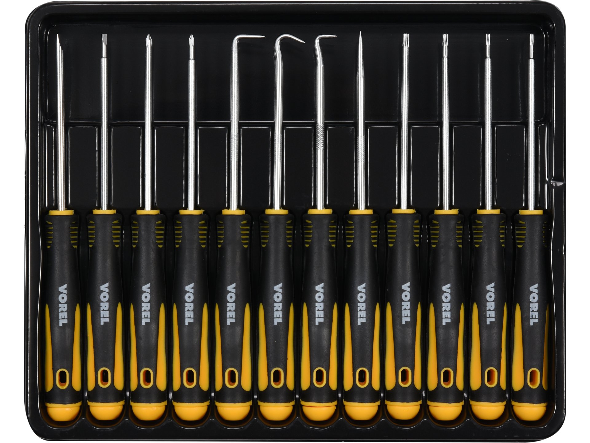 - 12 piese cu vârfuri variate (nivelat, Phillips, Torx)