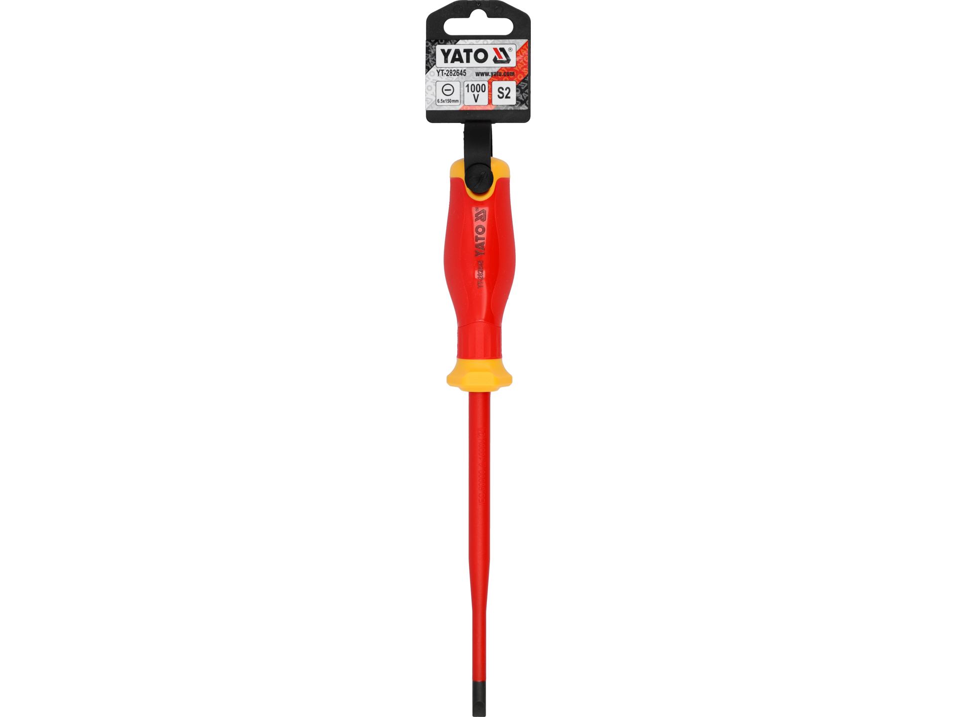 Șurubelniță izolată VDE cu vârf plat 6.5 mm, certificată pentru 1000 V, destinată lucrărilor electrice în condiții de siguranță maximă.