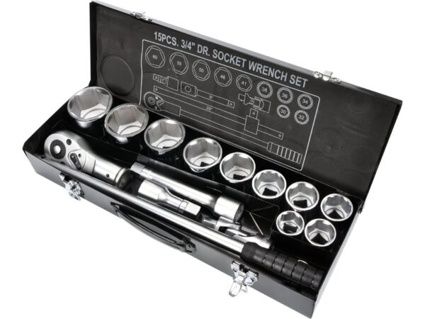 Trușă completa de 15 chei tubulare cu clichet reversibil și suport standard 3/4″ (19.0 mm). Construcția din oțel CrV 6140 garantează rezistență și durabilitate în condiții industriale grele. Cu 24 de dinți și AS-DRIVE, clichetul asigură acces facil în spații restrânse și control precis. Perfectă pentru reparații auto, servicii mecanice, industrie și aplicații agricole.