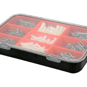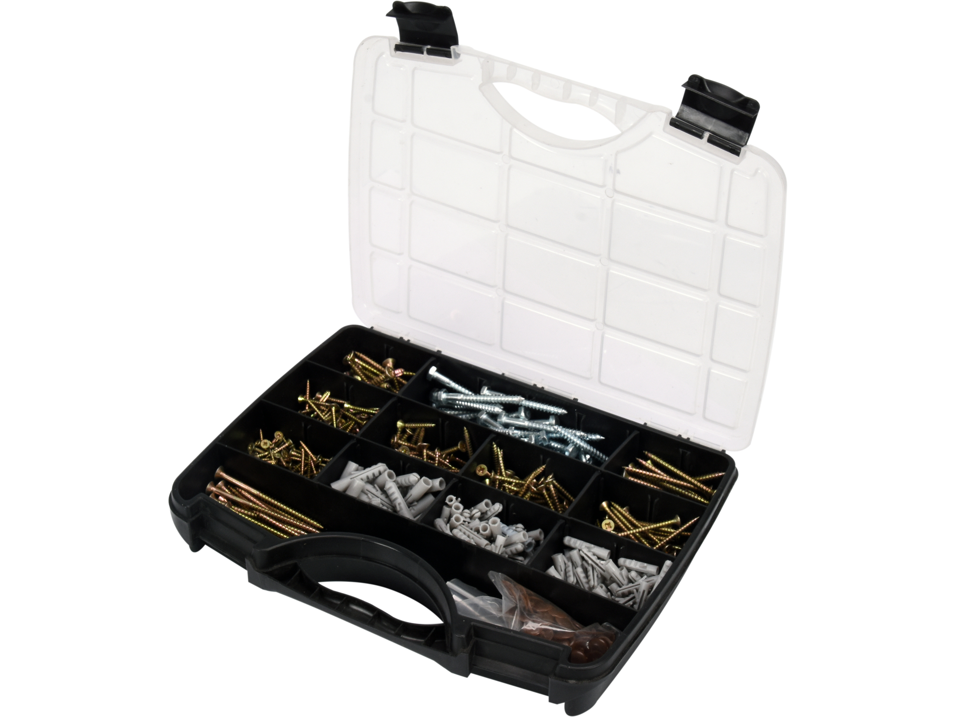 Trușă cu 620 șuruburi și dibluri de diverse dimensiuni, soluție completă pentru proiecte de construcție și fixări diverse.