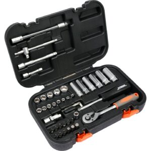 Trușă profesională cu 72 piese, cuprinde chei tubulare și accesorii din oțel carbon și CrV 6140. Dotată cu sistem AS-DRIVE cu 45 de dinți și suporturi de 1/4″ și 1/2″ pentru versatilitate maximă. Ideal pentru reparații auto, gospodărie și ateliere, cu ergonomie și precizie garantate.